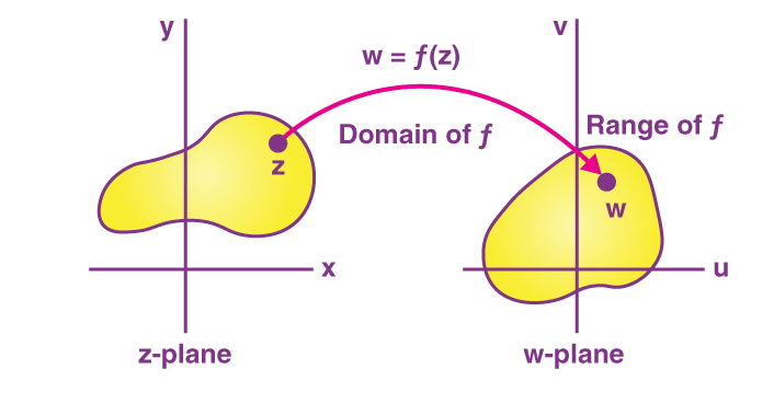 此外,w 的實部和虛部的標準符號是 u 和 v,其中 u 和 v 是 x 和 y 的函數。請注意,這里,D 稱為函數 f 的定義域。復變函數,即 w = f(z),通常表示為從復平面 z 到復平面 w 的映射或變換: