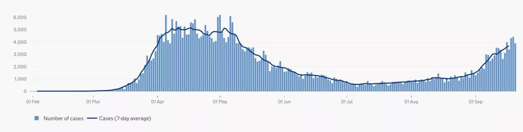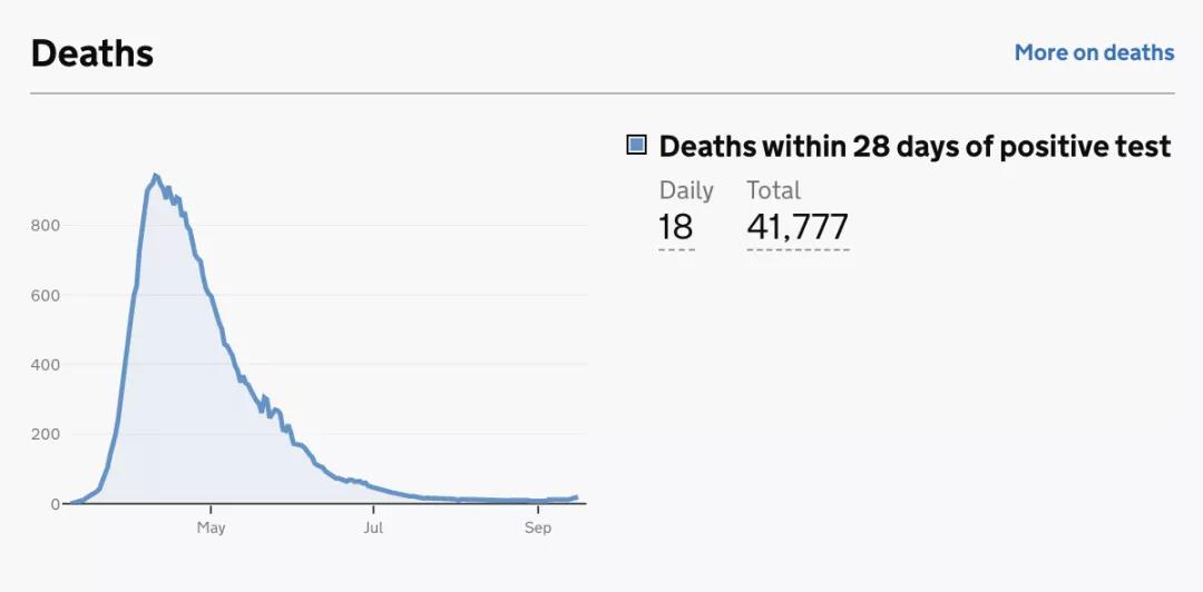截止至2020年9月20日(周日)英國時間09:00,累計檢測結果量17,995,470次;累計確診394,257例(+3,899);累計病亡41,777例(+18)。