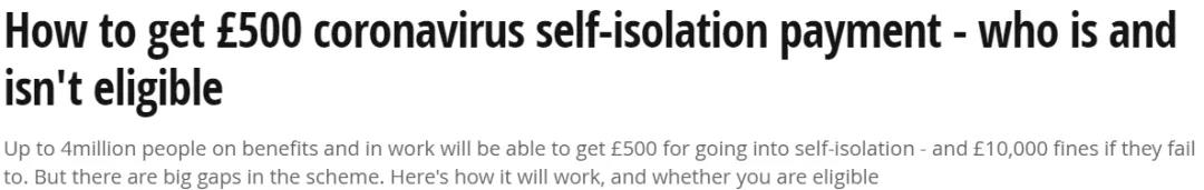 除了重罰,英國政府也對需要自我隔離的人拋出了甜頭。只要符合條件,需要自我隔離的人可以領到500英鎊補助。