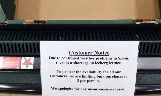 “敬告顧客:由于最近西班牙的天氣問題,現在生菜供應短缺。為了保護所有顧客的權益,每人限購三顆。我們為此造成的不便感到抱歉?!?/span>