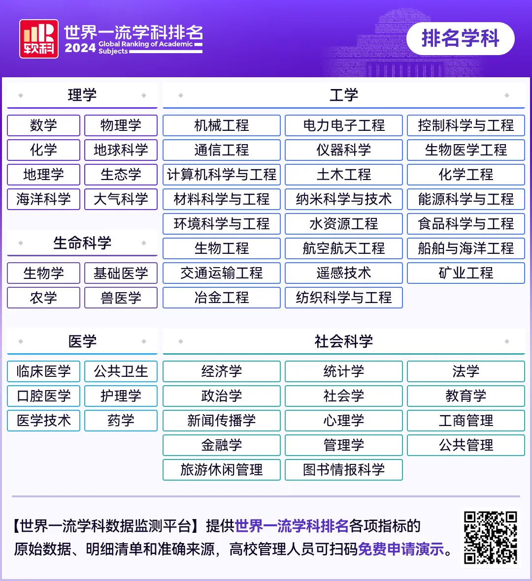 軟科 2024 年學科排名全面呈現全球高校學科建設的全景圖。對學生、高校及整個高等教育領域意義重大,將推動各方在未來的學術道路上積極進取,促進全球高等教育的繁榮發展。