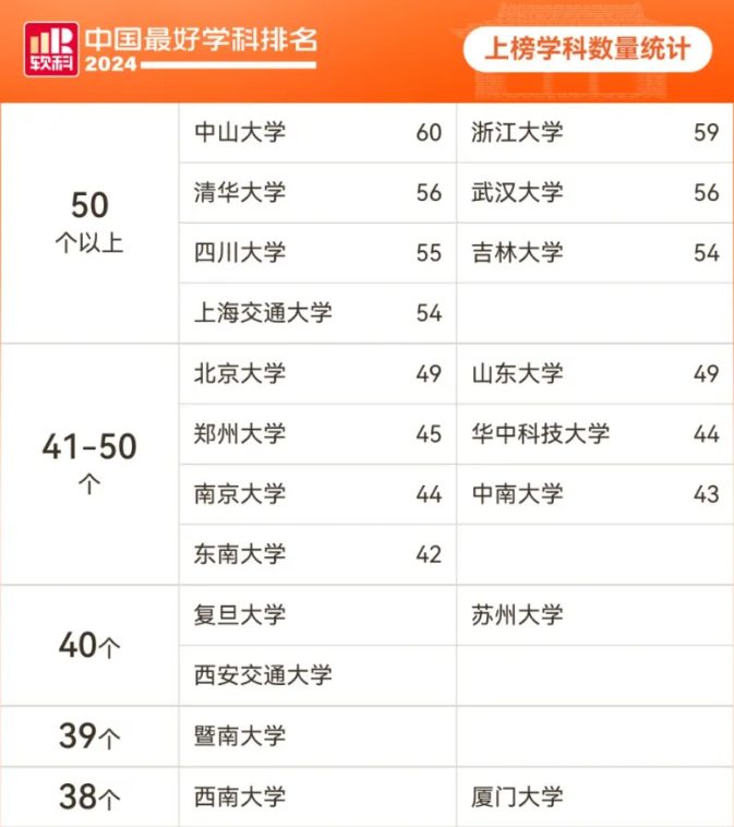 中山大學 60 個學科上榜居首,學科體系較為完備。