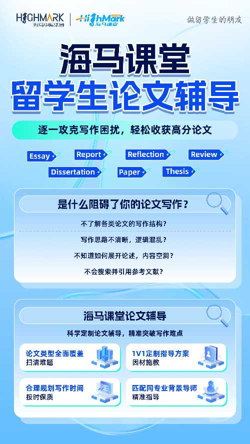 想要快速掌握論文寫作的底層邏輯嗎?那快來選擇海馬課堂的論文輔導(dǎo)吧!無論是Essay還是Dissertation,我們都可以幫助你找準論文方向、突破寫作難點。海馬課堂導(dǎo)師使用1V1高效授課方式,讓你不僅能寫出高分論文,更能掌握核心寫作技巧。選擇我們,來收獲高質(zhì)量論文吧。