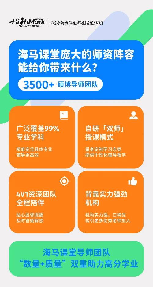 海馬中行業首推雙師模式,為留學生學業保駕護航。陪伴導師具有留學背景且教學經驗豐富,懂學生痛點;教學出身的導師能提供專業學習規劃,精準避坑提升成績。該模式還為學生明確短期學期目標和長期畢業求職規劃,陪伴導師在線守護,讓留學之路清晰不迷茫。導師給予全面指導,覆蓋學習、升學和就業,毫無保留分享經驗,助力學生全面發展。