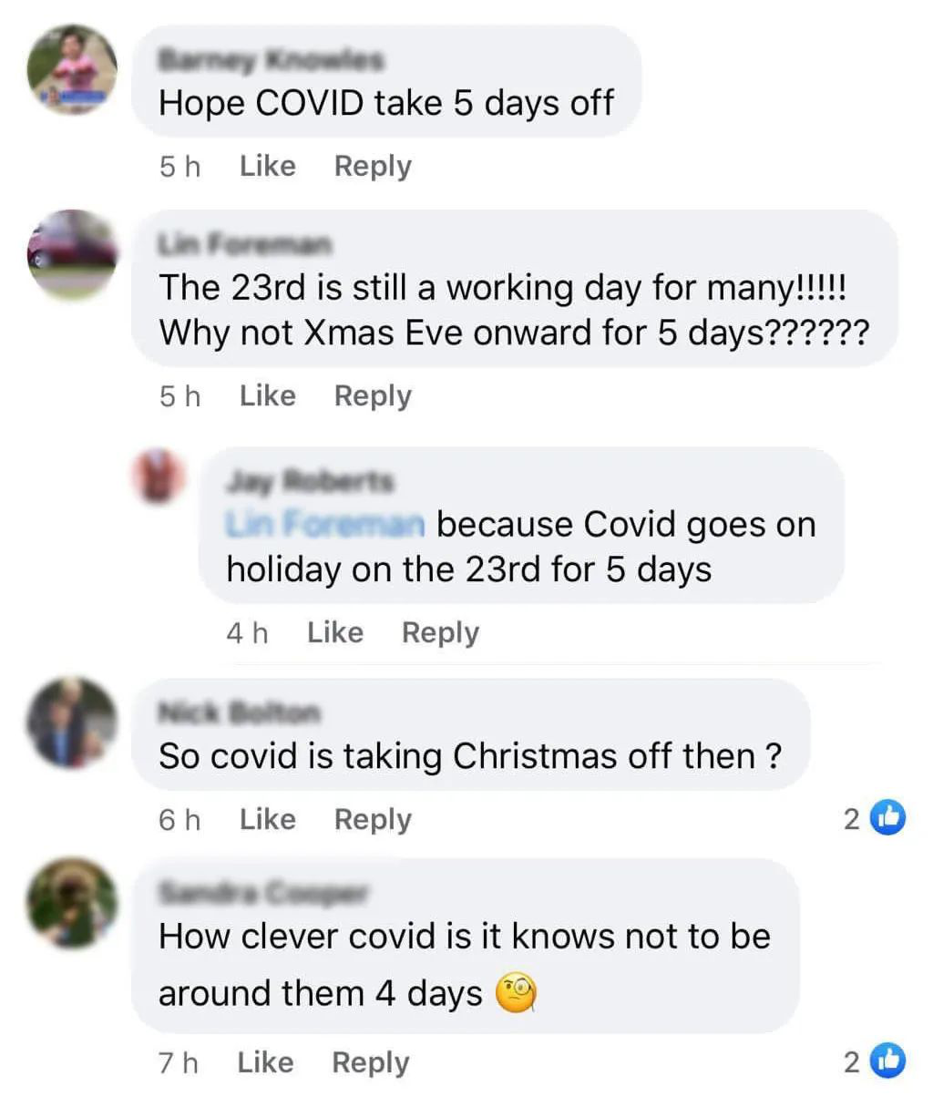 英格蘭、蘇格蘭、威爾士和北愛爾蘭領導人上周達成協議,在5天圣誕節假期內,3個家庭的成員可以聚在一起。但在12月28日以后,限制措施將恢復實行。