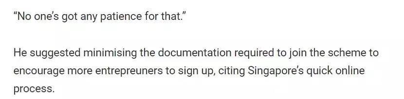 還有人建議盡量減少加入該計劃所需的文件,以鼓勵更多的企業(yè)家注冊,并引用新加坡的快速加入流程。