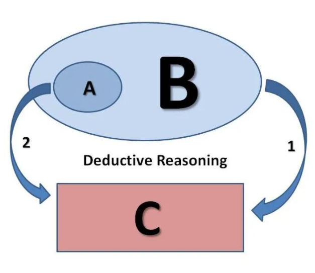 Deductive Reasoning符合我們世界里的許多自然規(guī)律,所以它的成立是比較容易的,不需要太多的條件,往往只要上述的各個(gè)假定都成立就行了。譬如,亞裔人(大群B)都是黃皮膚黑眼睛的(結(jié)論C),我(樣本A)是亞裔人(A屬于B),所以我是黃皮膚黑眼睛的。