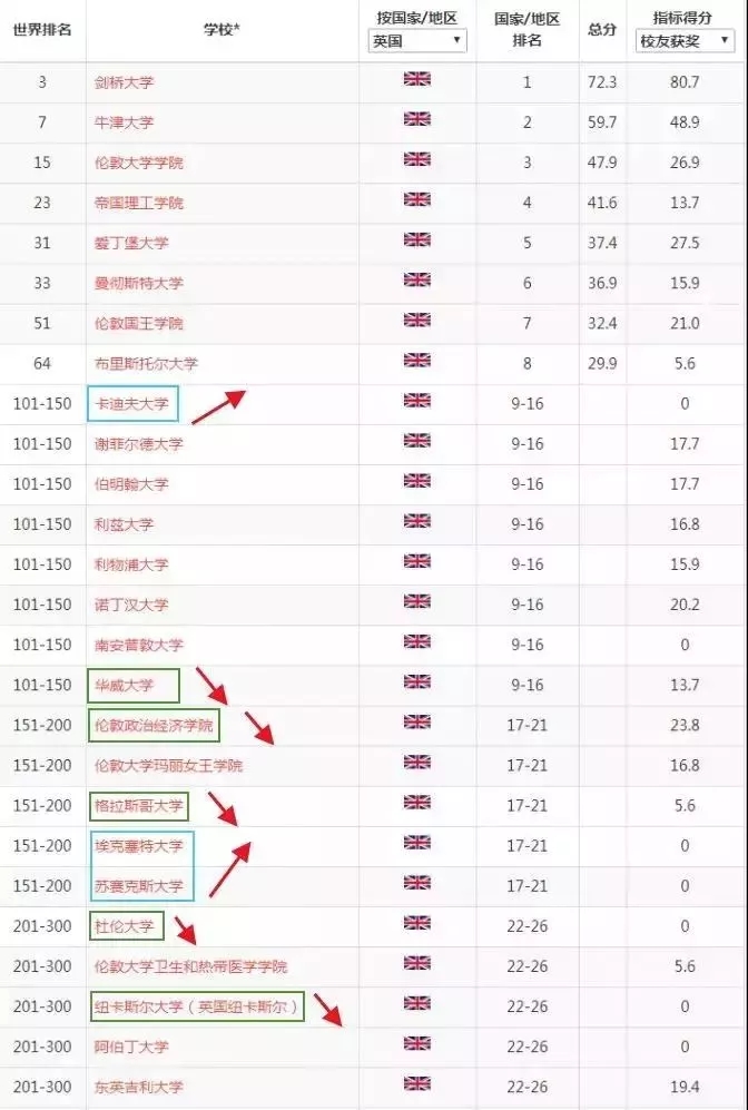 再來看看英國世界三百強(qiáng)的大學(xué)。