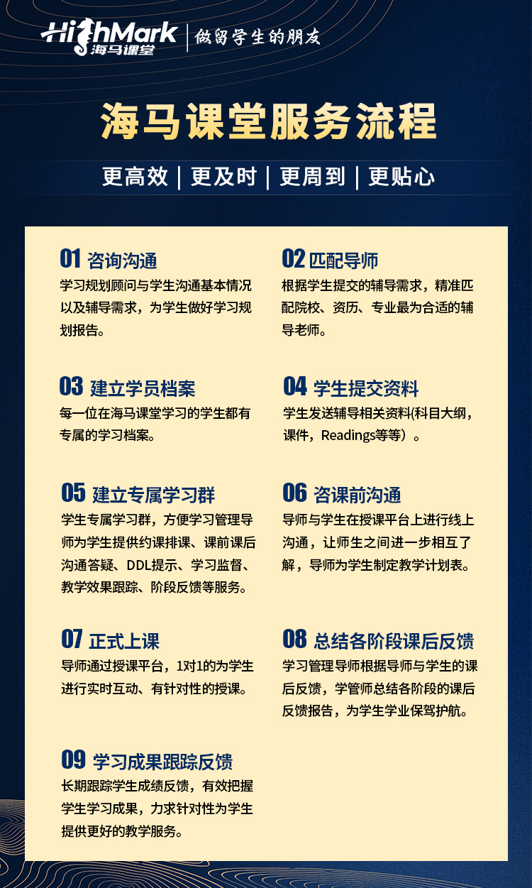 通過這次升級,海馬課堂做到了更高效地為學生規劃學習和匹配導師,不浪費一分一秒;也能更及時的發現學生學習過程中的問題,確保學生能夠徹底掌握知識點和一些學習干貨;在整個輔導過程中,學生一切與學習相關的需求海馬課堂都會全力滿足,全方位幫助學生提高GPA,努力做留學生可以信賴的朋友。