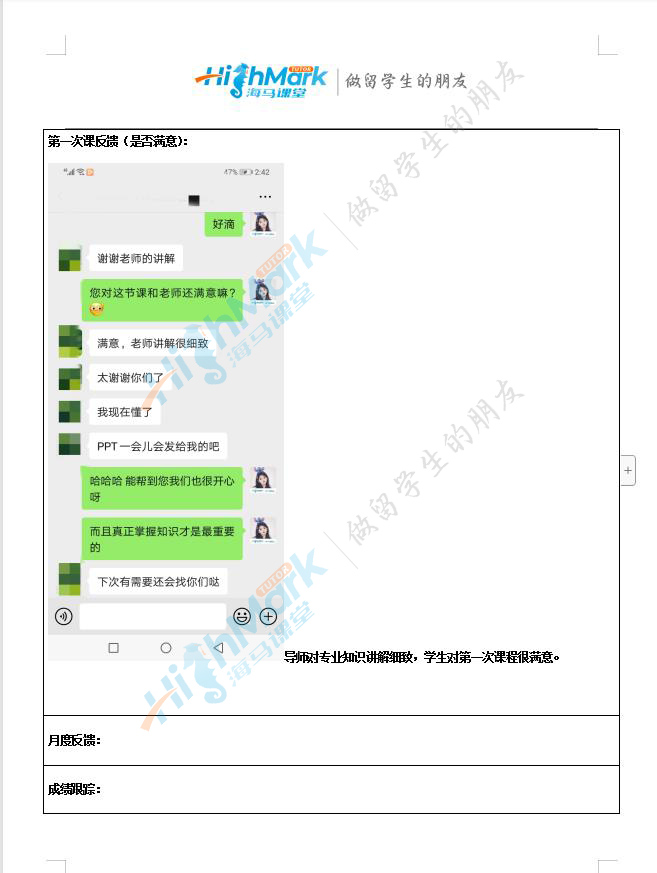 學生第一次上課結束后,學習管理導師會去詢問學生的課程體驗,根據學生的課后反饋和實際情況去調整教學計劃,讓學生的學習效果可以達到最大化,真正做到為留學生的學業保駕護航。