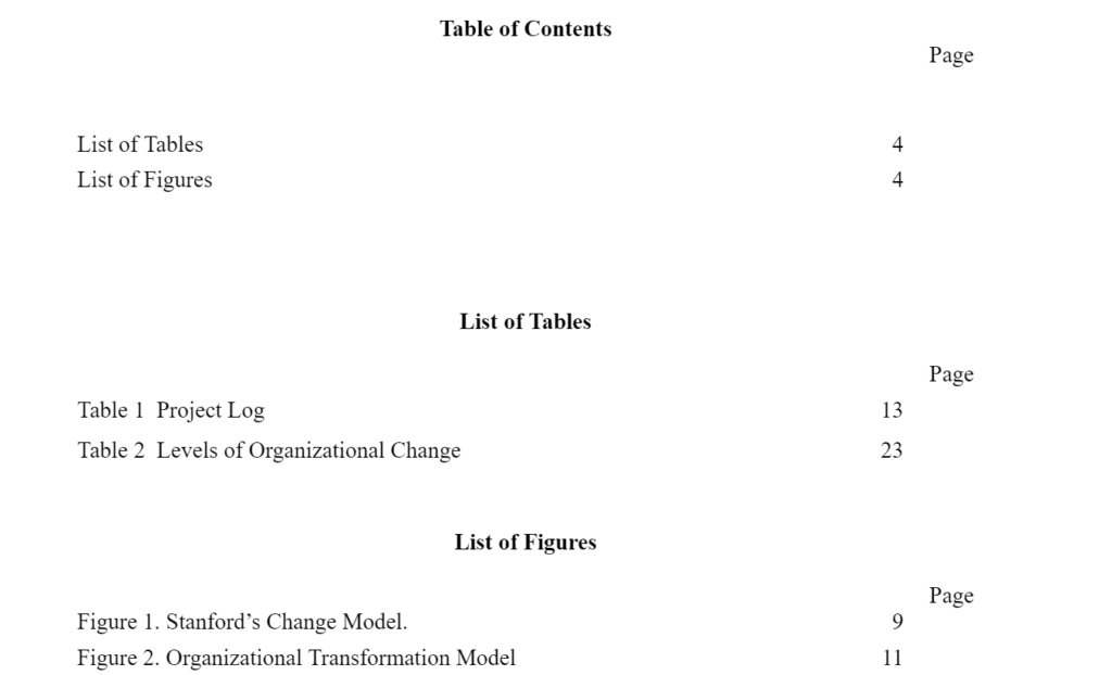 在下面的示例中,有三個級別的標題。表和圖列表在其他內容的底部提供。根據您所在大學的要求,目錄中的部分可能會有所不同。