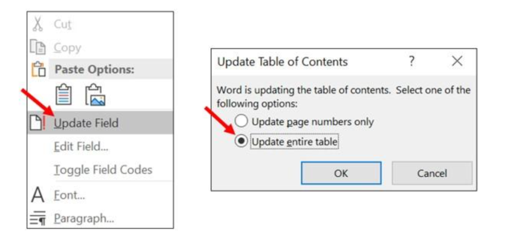 要更新頁碼,請右鍵單擊文檔中的目錄并選擇更新字段。然后,將出現更新目錄框。