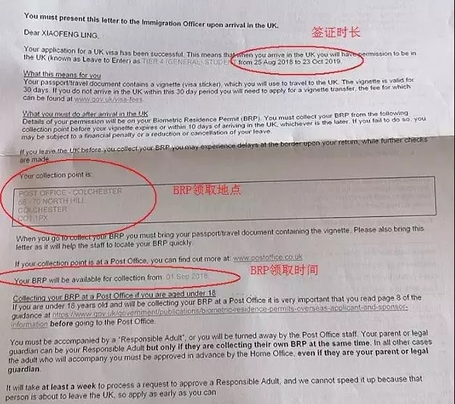 圖中方框部分就是 BRP 卡的領取地點,橢圓標注處會告知大家 BRP 卡的領取時間。大部分同學前往郵局(Post Office)領卡即可,具體需要去哪個郵局通常是根據提交簽證申請時所提供的郵編來確定的。