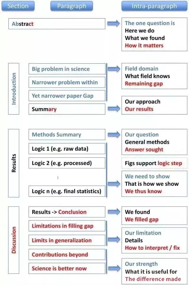 講故事的方法多種多樣,C-C-C 結(jié)構(gòu)作為其中一種,更適用于有耐心、決定花時間理解文章的讀者,但這種結(jié)構(gòu)對沒有耐心的讀者并不友善。好在當(dāng)代科學(xué)文章的結(jié)構(gòu)解決了這樣的問題,標(biāo)題與摘要使讀者可以快速了解文章內(nèi)容。因此,看完引言的讀者很可能會被吸引,并有著足夠的耐心繼續(xù)閱讀文章。而且,過于注重 “內(nèi)容優(yōu)先” 的科學(xué)論文還會產(chǎn)生另一個風(fēng)險:讀者在閱讀過程中會忽視一些段落,這些段落可能是鞏固文章可信度的重要部分,從而使他們質(zhì)疑你的文章。因此,我們建議將 C-C-C 結(jié)構(gòu)作為科學(xué)文獻(xiàn)的默認(rèn)結(jié)構(gòu)。