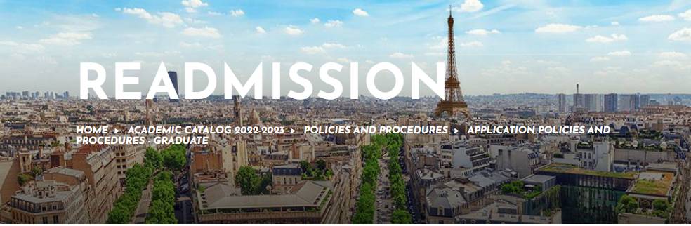 從大學退學的學生,或缺席兩個或更多學期(不包括夏季),并以良好的學術地位離開大學的學生,必須通過重新錄取申請表向教務處提出申請,要求重新錄取。這一請求需要由招生辦公室考慮。在某些情況下,可能會要求提供額外的材料。