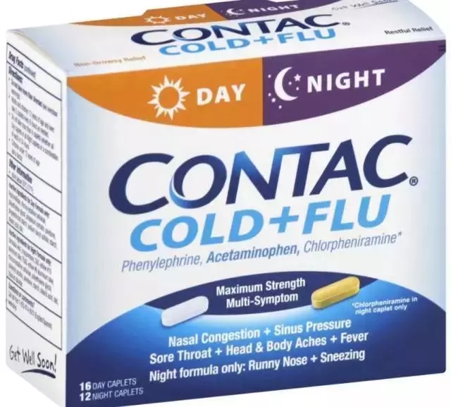 康泰克(Contac),和國內的康泰克屬于同種。一盒里面有白天片和黑夜片,針對鼻塞、流鼻涕、流眼淚等癥狀。